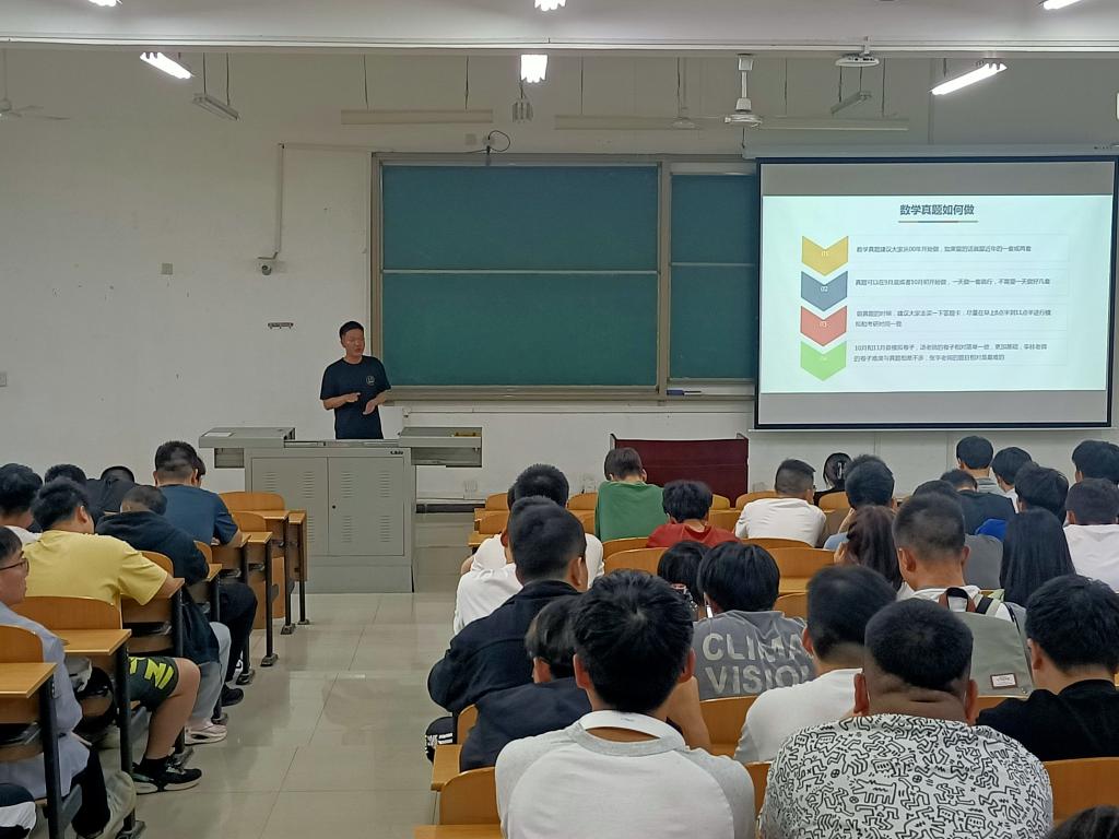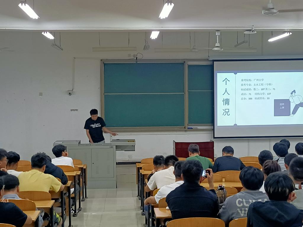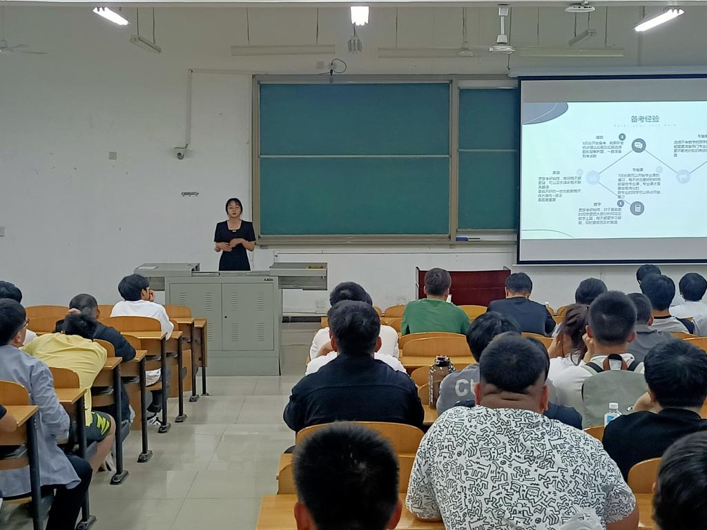 会上,2024届毕业生王梓梁、韩雨轩、李毅三位同学结合自身经历,主要从选择院校、公共课复习技巧、专业课准备技巧、复试准备、注意事项、心态调整等多方面给同学们分享了自己的考研经验。