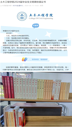 2024届毕业生文明离校倡议书”,号召全体毕业生,牢记习近平总书记对广大青年的嘱托,争做有理想、敢担当、能吃苦、肯奋斗的新时代好青年,在推进强国建设、民族复兴伟业中展现青春作为、彰显青春风采、贡献青春力量,奋力书写为中国式现代化挺膺担当的青春篇章。