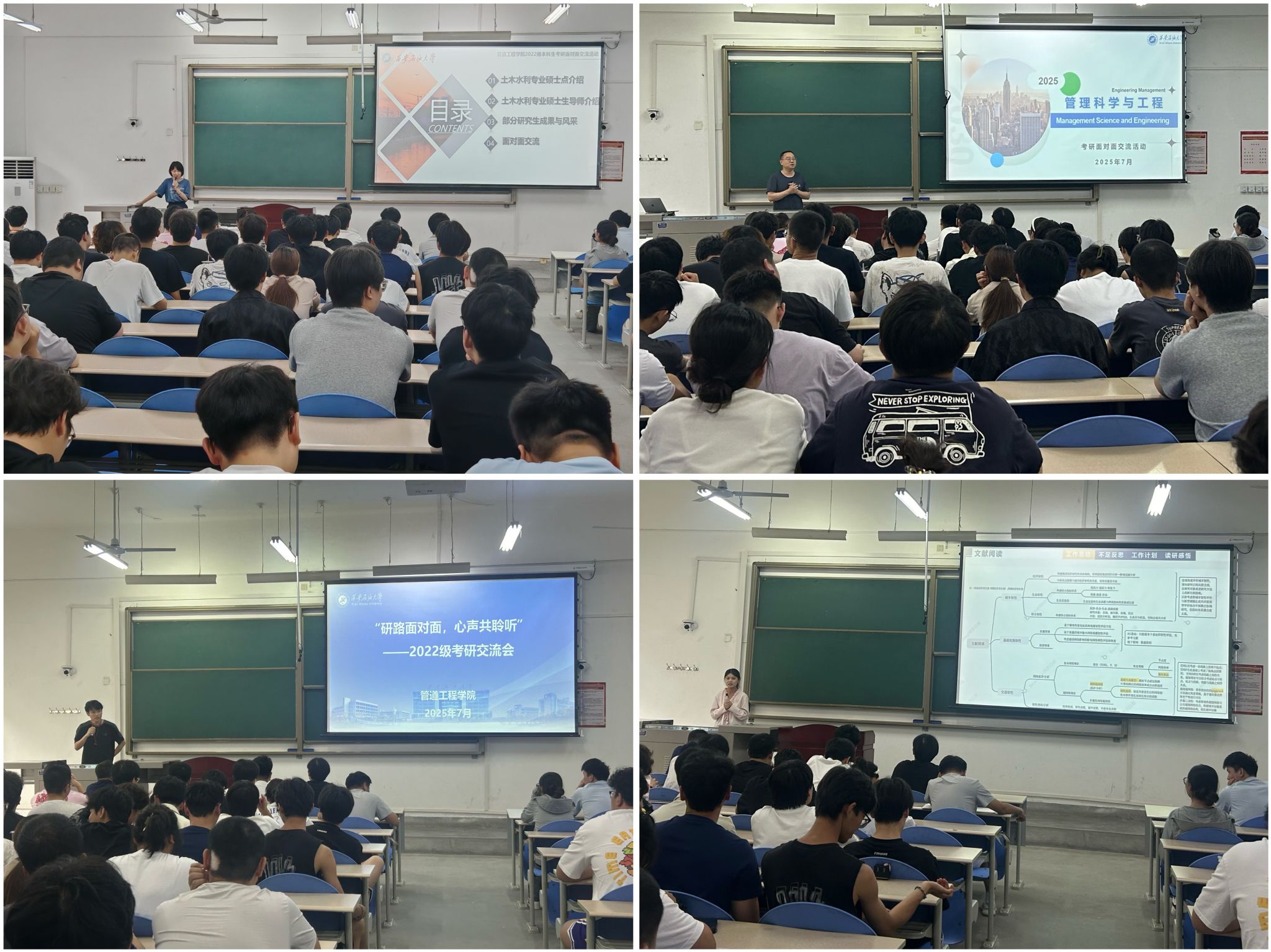 在师生面对面交流环节,现场气氛热烈。同学们就考研复习过程中的疑惑、如何选择院校专业、如何应对考研压力等问题积极提问,老师们和研究生代表一一耐心解答,给予了专业的建议和指导。师生们还就专业发展方向、就业前景等话题展开了深入探讨,为同学们拓宽了视野,明确了方向。