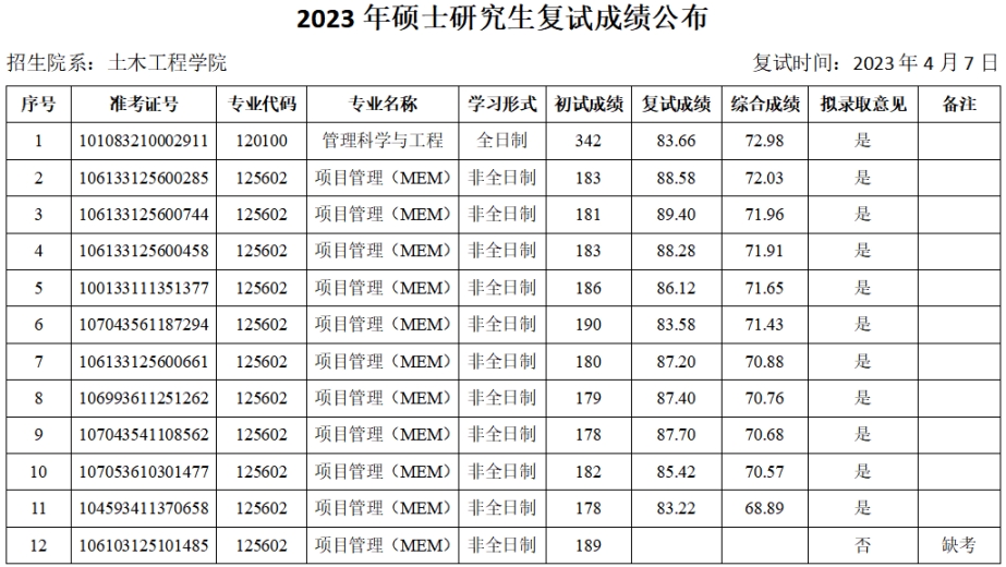 2023年硕士研究生复试成绩(调剂第一批—管理科学与工程、项目管理(MEM))予以公布。如有异议,可通过以下方式反映。