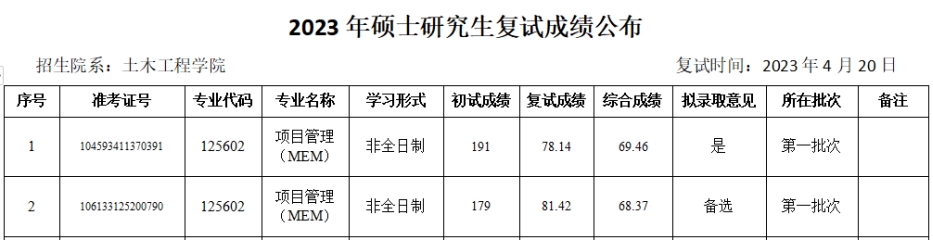 2023年硕士研究生复试成绩(调剂第四批—项目管理(MEM))予以公布。如有异议,可通过以下方式反映。