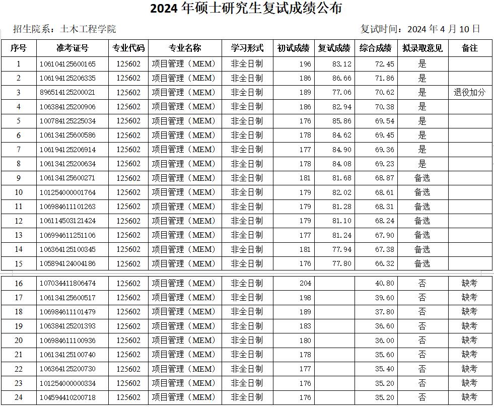 2024年硕士研究生复试成绩(调剂第三批—项目管理)予以公布。如有异议,可通过以下方式反映。