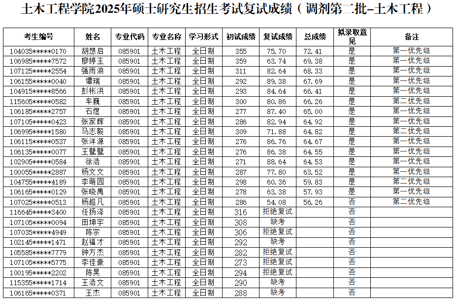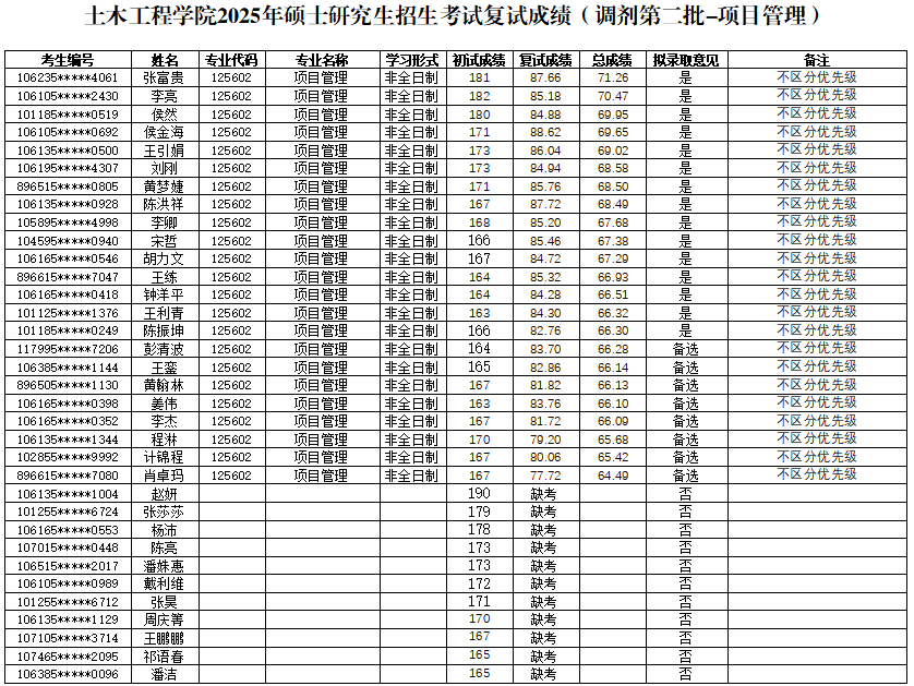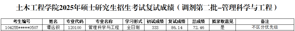 2025年硕士研究生复试成绩(调剂第二批—管理科学与工程、项目管理、土木工程)予以公布。如有异议,可通过以下方式反映。