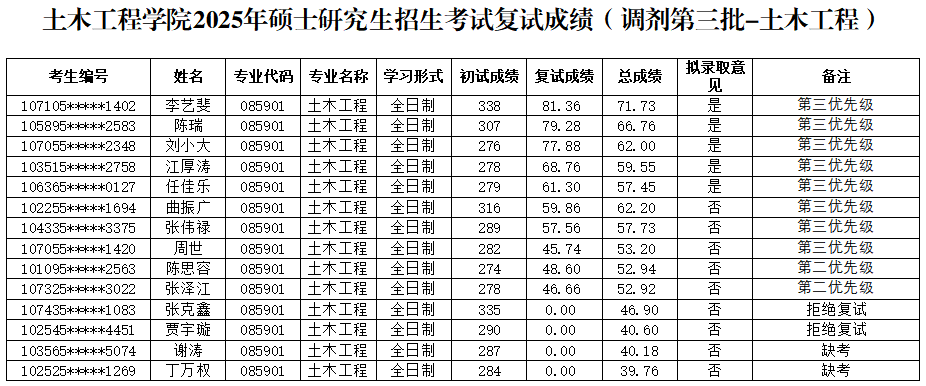 根据教育部及陕西省教育考试院相关文件精神和要求,现将斗牛游戏 2025年硕士研究生复试成绩(调剂第三批—土木工程)予以公布。如有异议,可通过以下方式反映。