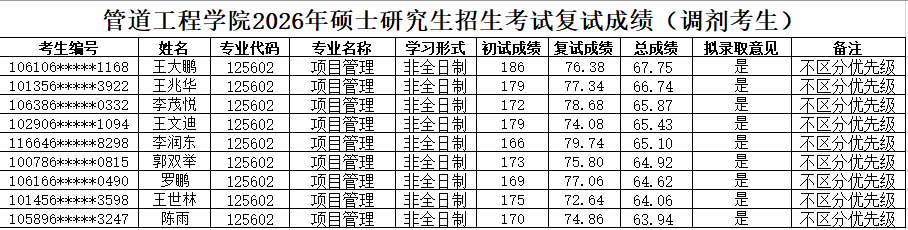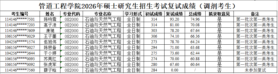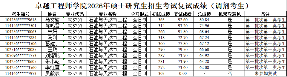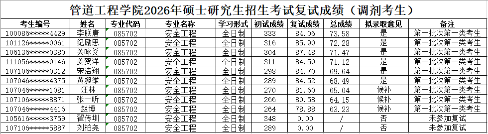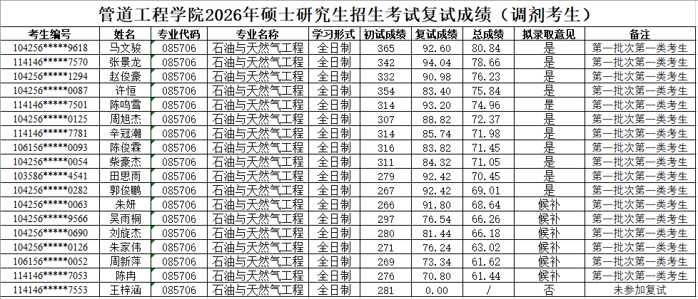 2026年硕士研究生招生复试录取工作实施细则》,现将2026年硕士研究生复试成绩(调剂第一批-石油与天然气工程、安全工程、管理科学与工程、项目管理)予以公示。如有异议,可通过以下方式反映。