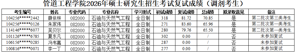 2026年硕士研究生招生复试录取工作实施细则》,现将2026年硕士研究生复试成绩(调剂第二批-石油与天然气工程(082000))予以公示。如有异议,可通过以下方式反映。