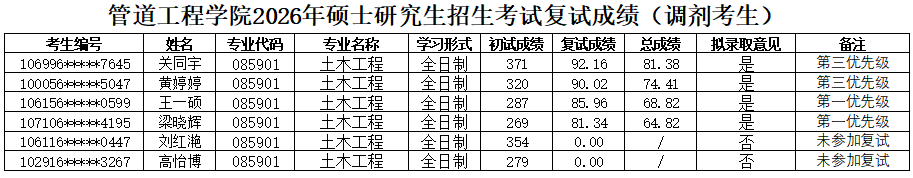 2026年硕士研究生招生复试录取工作实施细则》,现将2026年硕士研究生复试成绩(调剂第二批-土木工程)予以公示。如有异议,可通过以下方式反映。