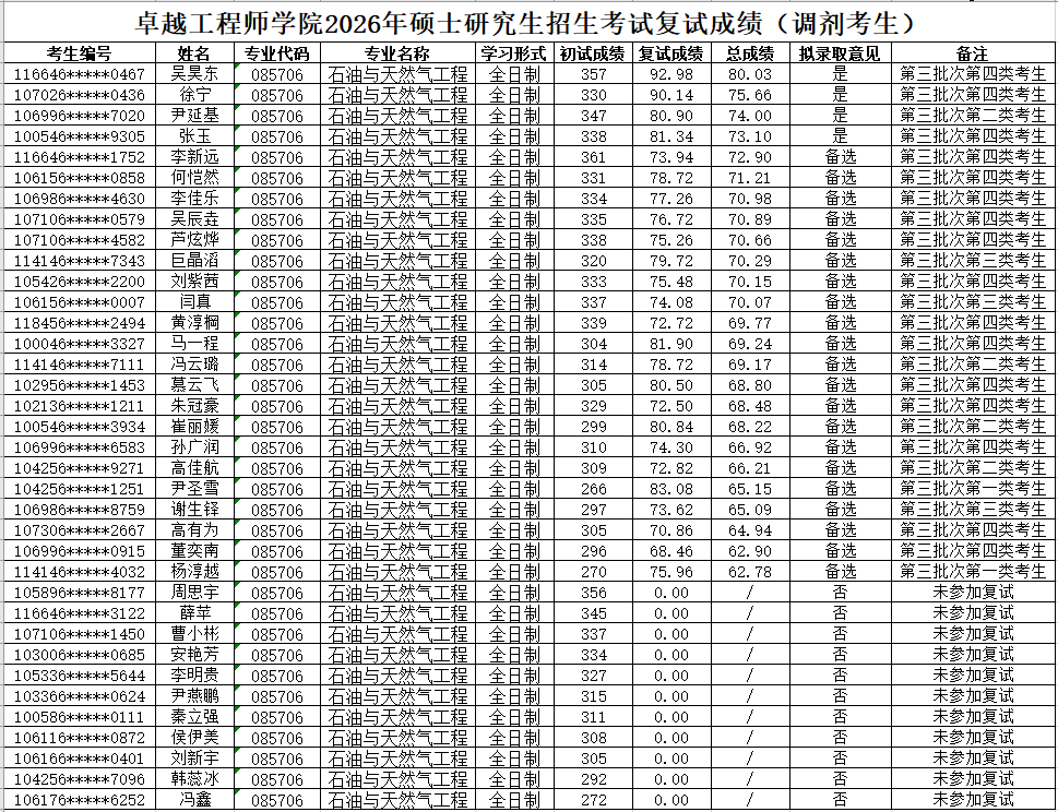 2026年硕士研究生招生复试录取工作实施细则》,现将2026年硕士研究生复试成绩(调剂第三批-石油与天然气工程(085706))予以公示。如有异议,可通过以下方式反映。